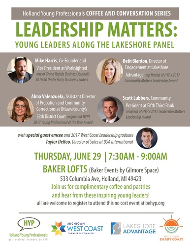 Join Holland Young Professionals, West Coast Chamber, Lakeshore Advantage and Michigan Smart Coast on Thursday, June 29 at Baker Lofts for a Coffee and Conversation panel featuring inspiring young local leaders from businesses along the lakeshore!